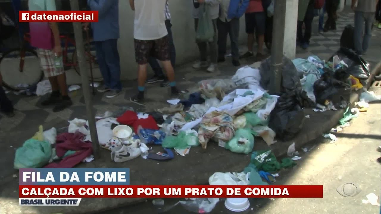 Povão na fila da fome tem que ficar em calçada lotada de lixo a espera de um prato de comida